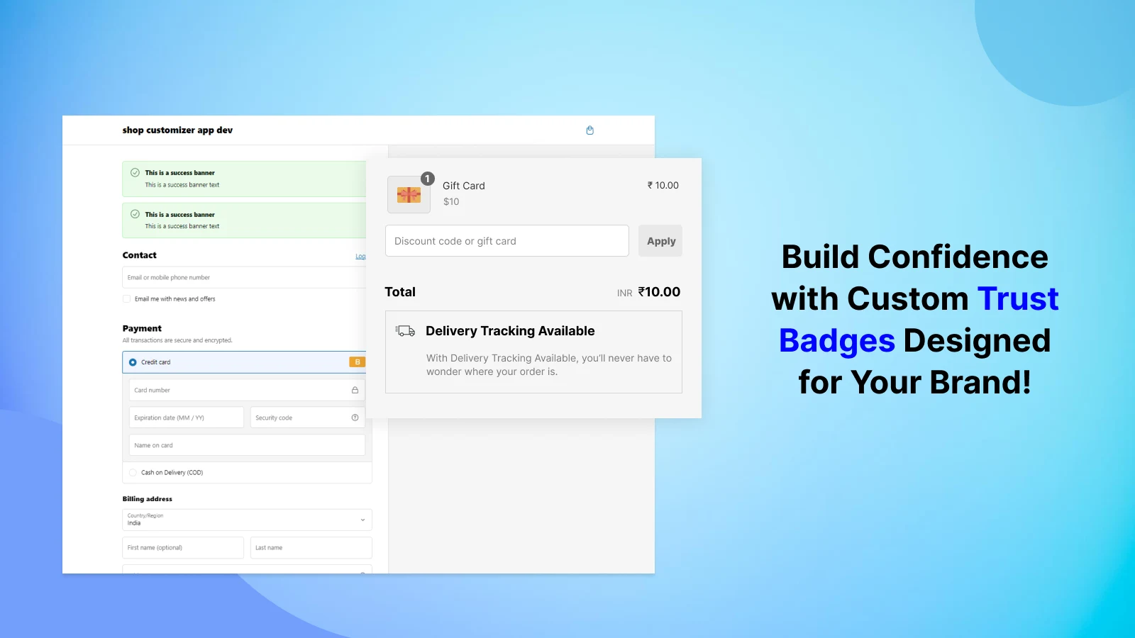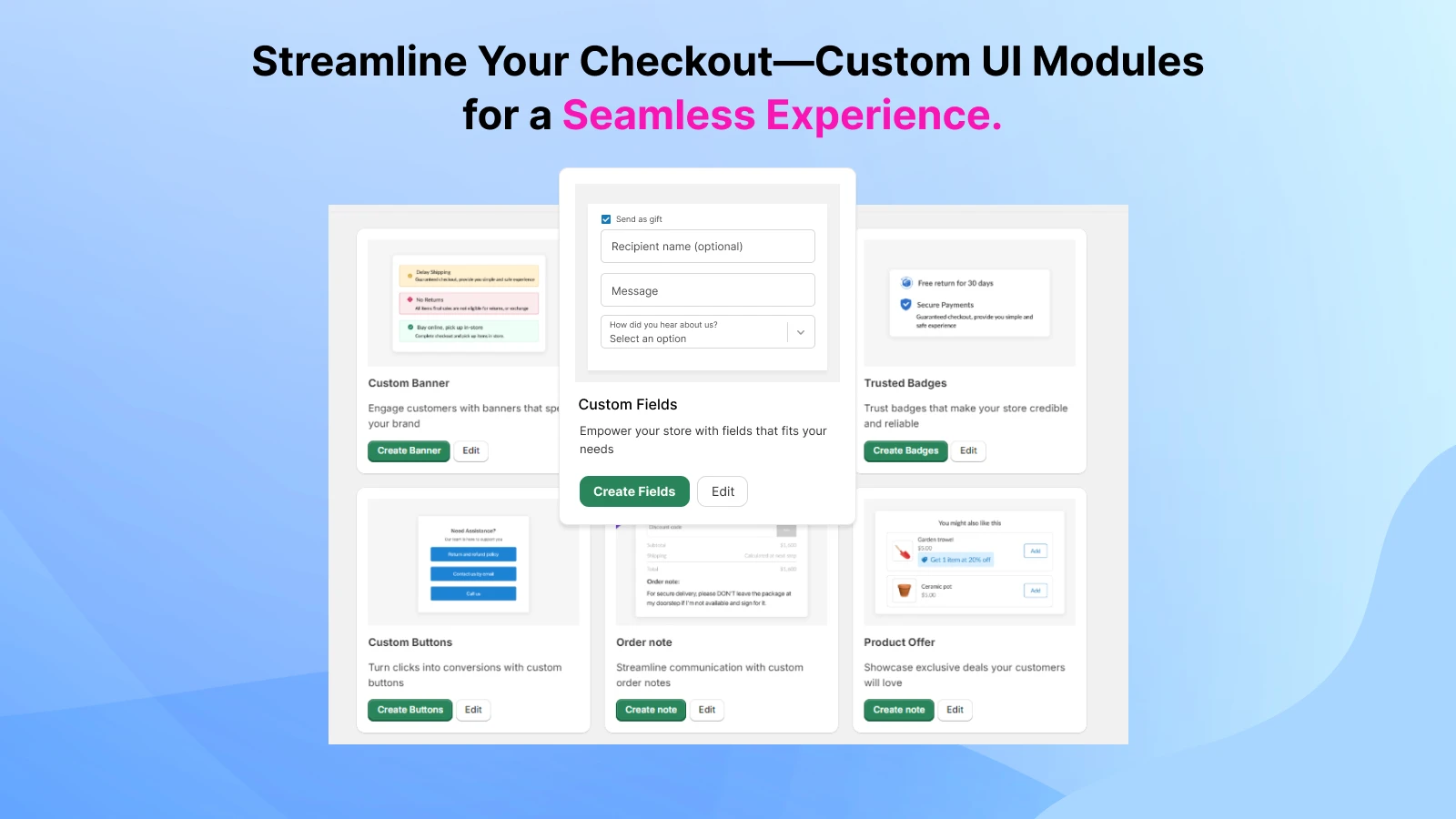 Our checkout app currently features four powerful modules—custom banners, custom fields, trust badges, and custom buttons—designed to enhance your checkout page. Additionally, the checkout styling module allows you to control the overall look and feel of the page. These custom modules can be dynamically displayed based on conditions such as cart quantity, discount code, product name, customer country, selected payment method, and cart total.